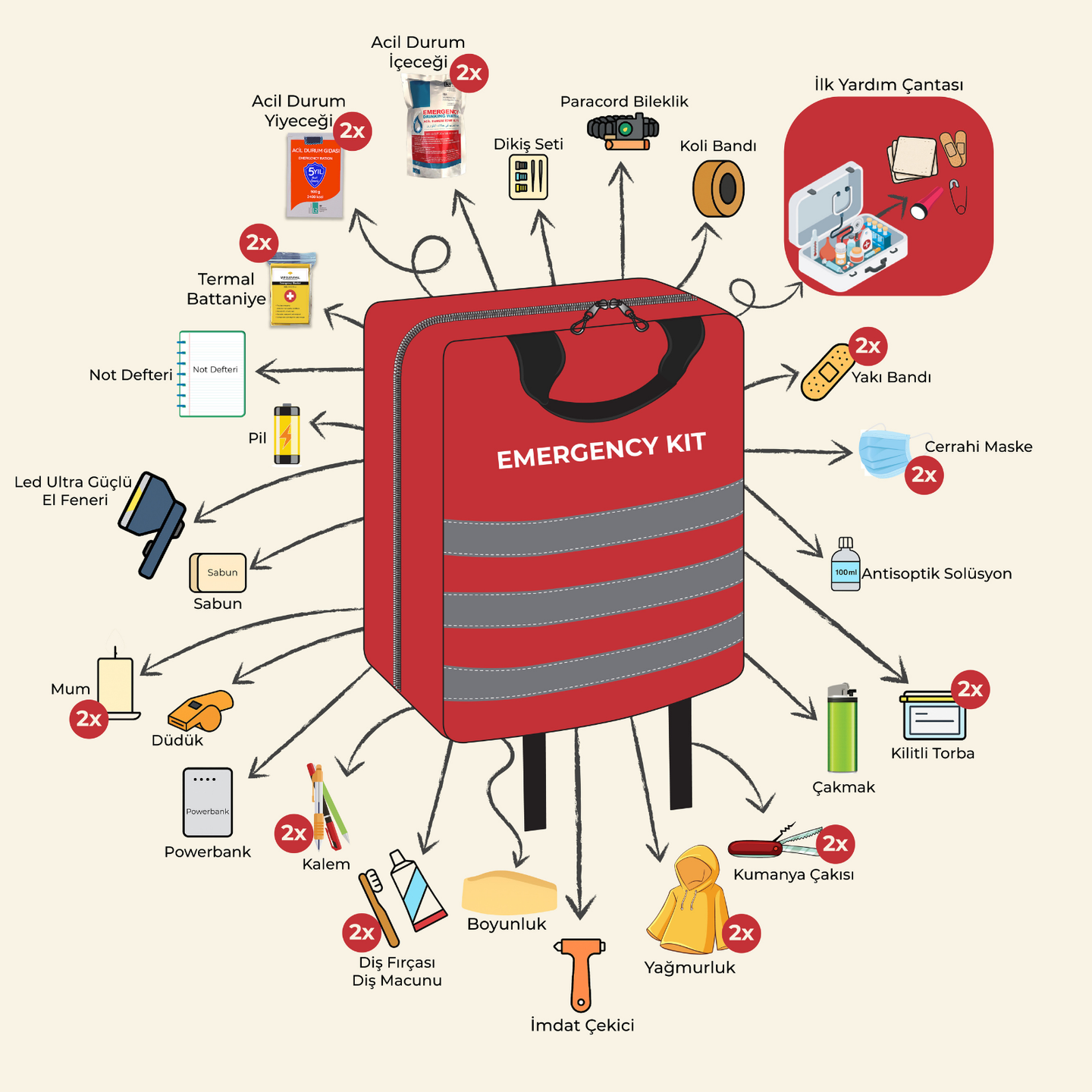 Deprem, sel, yangın, fırtına veya beklenmedik bir afet anında saniyeler içinde doğru ekipmana ulaşmak hayat kurtarır.Tescilli Reflektörlü Deprem Çantası, yüksek görünürlük sağlayan tasarımı, dayanıklı yapısı ve FEMA standartlarına uygun içeriğiyle acil durumlara profesyonel düzeyde hazırlık sunar.Ev, iş yeri, okul, araç içi güvenlik ve doğa sporları gibi farklı senaryolarda kullanıma uygundur.