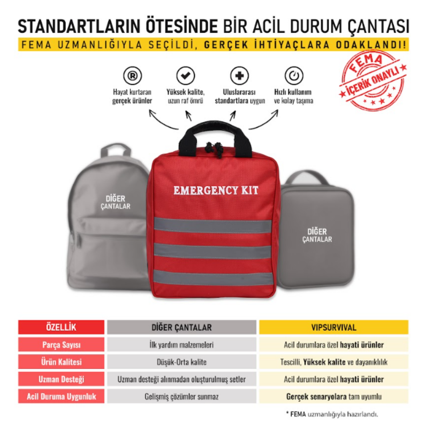 Bu çanta, FEMA (Federal Emergency Management Agency) standartları temel alınarak afet yönetimi alanında uzman ekipler tarafından hazırlanmıştır. İçeriğinde yer alan malzemeler, afet anında ihtiyaç duyulabilecek tüm temel ekipmanları kategorize edilmiş şekilde barındırır. Toplamda 220 parçadan oluşan donanımıyla, bireysel ve kurumsal kullanım için eksiksiz bir çözümdür.